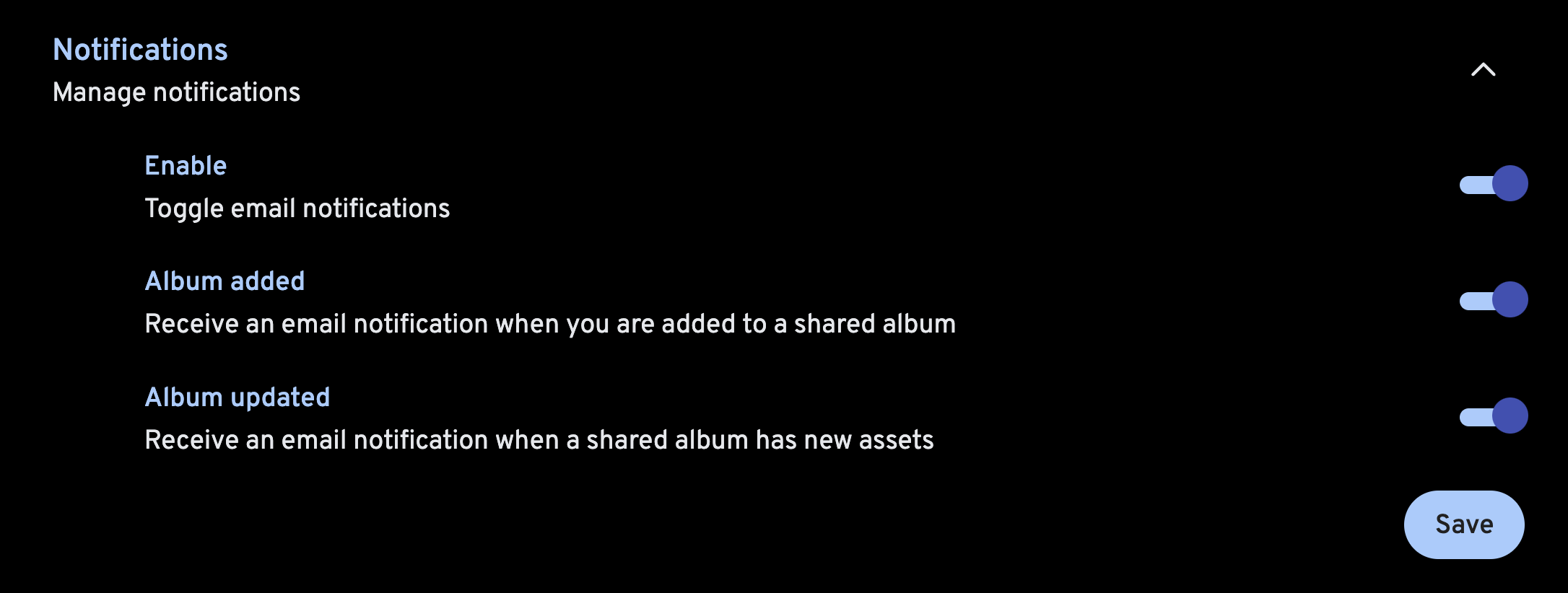 Immich supports the option to send notifications via Email for the following events: